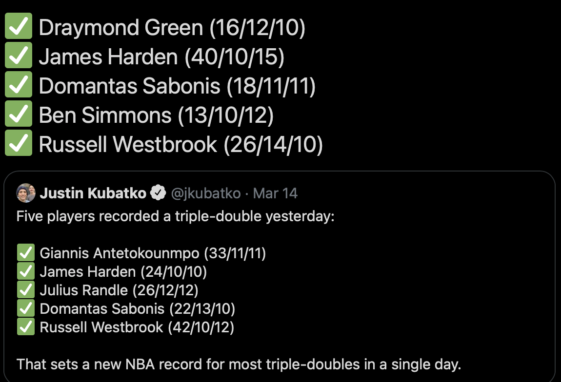 大三双时代!今日又有5位球员得到三双追平4天前的历史记录