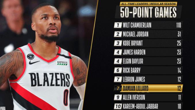 利拉德生涯已12次单场砍下50+,追平詹姆斯排在历史第7