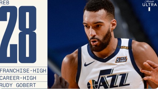 博球00703月15日讯 今日NBA常规赛爵士以119-131不敌勇士。 据爵士官方报道,本场比赛鲁迪-戈贝尔抓下28篮板刷新了队史单场篮板记录,同时也刷新了个