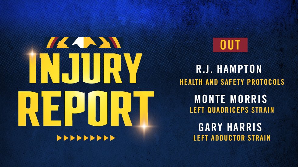 博球00703月15日讯 掘金官方发布了明日比赛的伤病报告。 RJ-汉普顿(健康与安全协议)、蒙特-莫里斯(左侧股四头肌拉伤)、加里-哈里斯(左侧内收肌拉伤)将