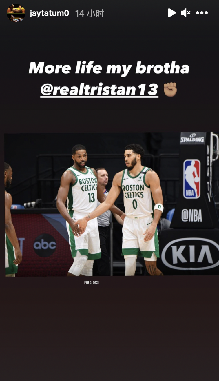 博球00703月14日讯 今日,凯尔特人球员杰森-塔特姆更新Ins,晒出一张与队友特里斯坦-汤普森的赛场合影为其庆生。 “生日快乐,兄弟@特里斯坦-汤普森