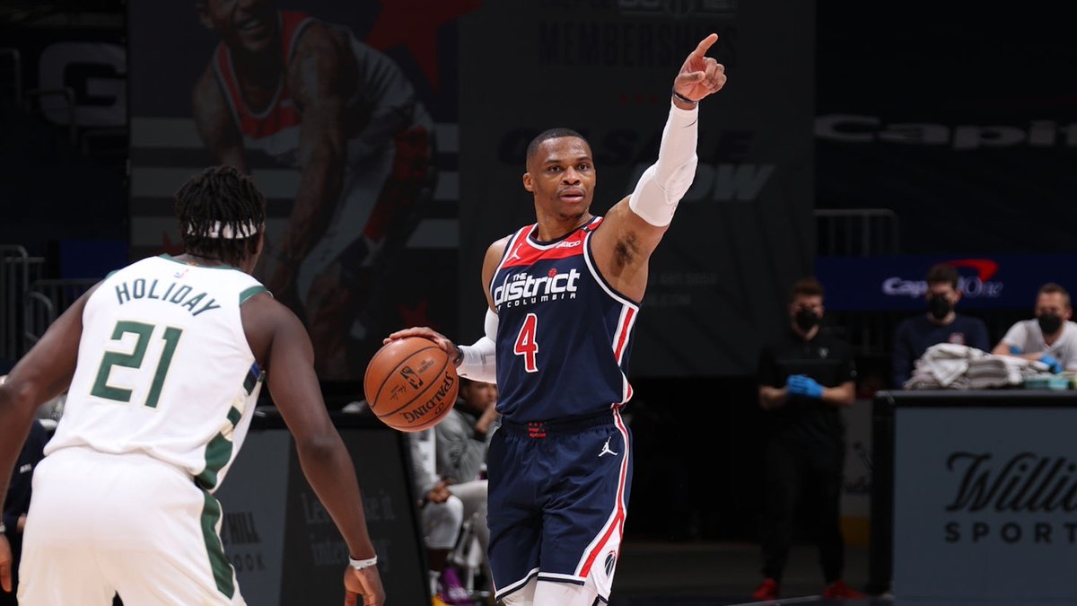 博球0073月14日讯 今天NBA常规赛奇才主场对阵雄鹿的比赛已经结束。全场战罢,奇才以119-123不敌雄鹿。 本场比赛,奇才后卫拉塞尔-威斯布鲁克出战38分