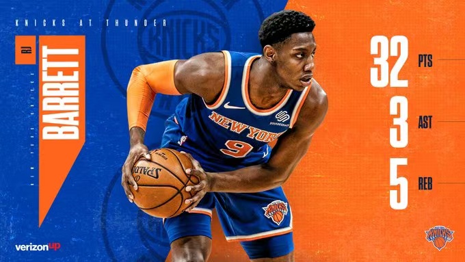 博球00703月14日讯 今天NBA常规赛尼克斯客场迎战雷霆的比赛已经结束。全场战罢,尼克斯以119-97战胜雷霆。 本场比赛,尼克斯锋卫摇摆人RJ-巴雷特