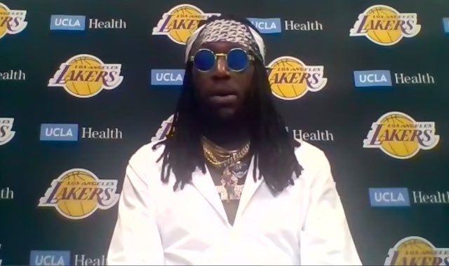 博球00703月13日讯 在今日结束的一场常规赛中,湖人以105-100击败步行者。 赛后,湖人球员凯尔-库兹马更新推特转发了队友蒙特雷兹-哈勒尔赛后采访穿搭(