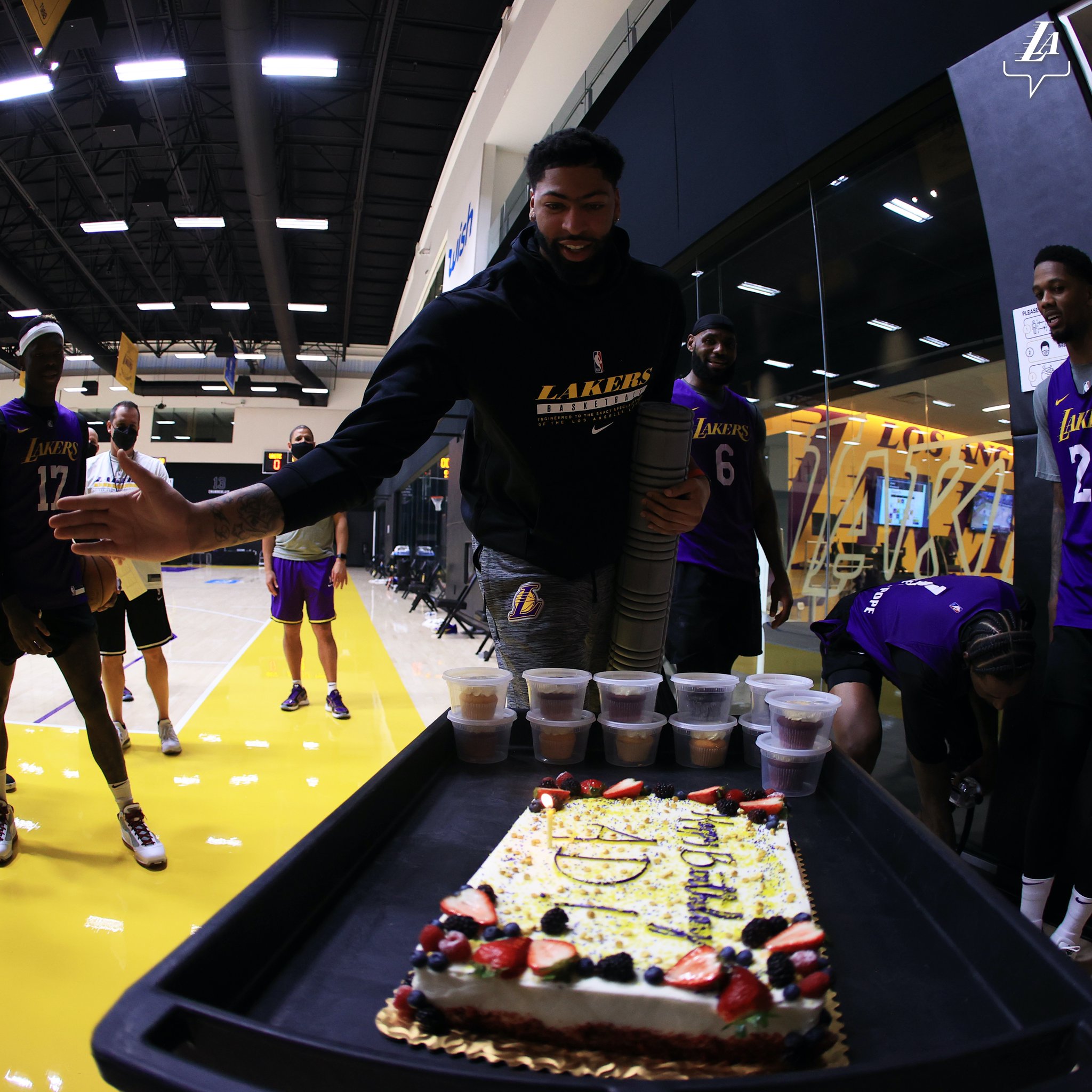 博球00703月12日讯 湖人官方推特今日发布一组前锋安东尼-戴维斯在训练场边与队友庆祝28岁生日的照片。 戴维斯在训练场边得到了一块生日蛋糕,上面写着“生日快