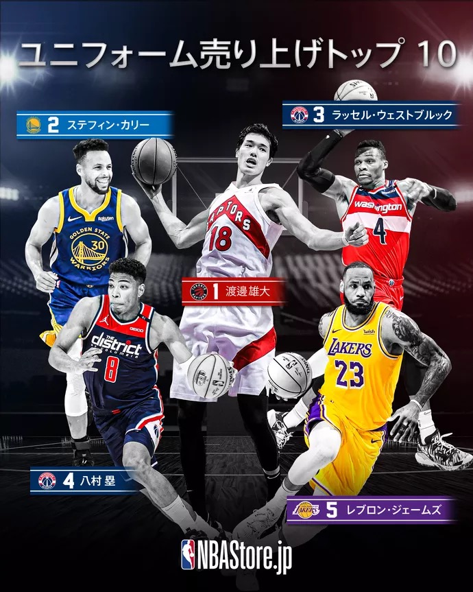 博球00703月11日讯 近日,NBA官方日本商店公布了NBA球员在日本的球衣销量,猛龙球员渡边雄太在日本的球衣销量高居全NBA第一,排名2-5位的分别是斯蒂芬