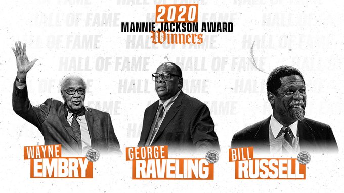 博球00703月11日讯 今日,奈史密斯篮球名人堂宣布,NBA名宿比尔-拉塞尔、前NBA球员韦恩-恩布里、著名大学教练George Raveling获得了202