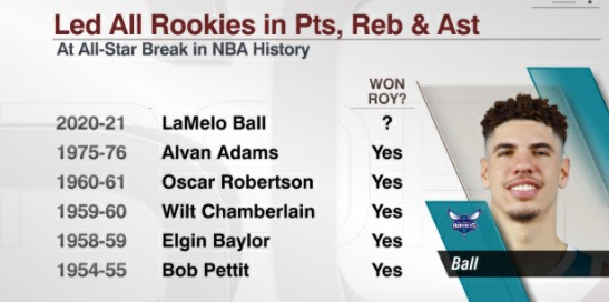 截至全明星周,鲍尔得分篮板助攻领衔所有新秀成史上第六人