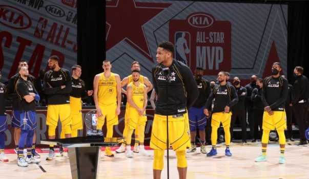 博球00703月08日讯 在今日结束的全明星正赛中,勒布朗队以170-150击败杜兰特队,扬尼斯-阿德托昆博当选全明星MVP。 赛后,阿德托昆博在颁奖典礼上接