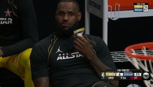 博球00703月08日讯 今年的全明星正赛正在进行当中。 下半场比赛,勒布朗队的湖人球员勒布朗-詹姆斯没有首发出场,坐在场边吃起零食。 湖人队友凯尔-库兹马更新
