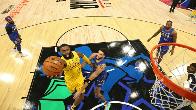 博球00703月08日讯 在今天结束的全明星正赛中,勒布朗队170-150击败杜兰特队。 本场比赛,代表勒布朗队首发出战的雄鹿前锋扬尼斯阿德托昆博出战19