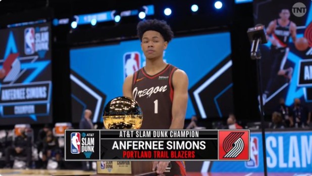 开拓者球员安芬尼-西蒙斯获得2021年全明星扣篮大赛冠军