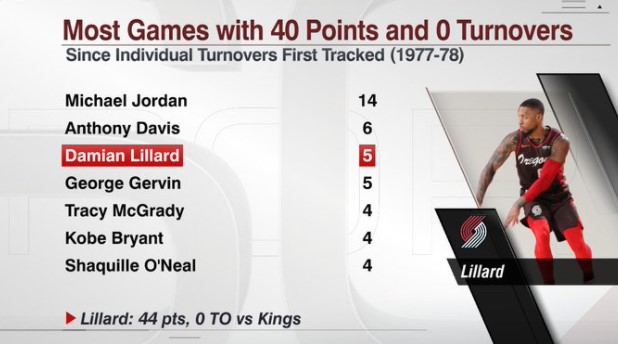 利拉德第5次得分40+且0失误,仅少于乔丹和戴维斯