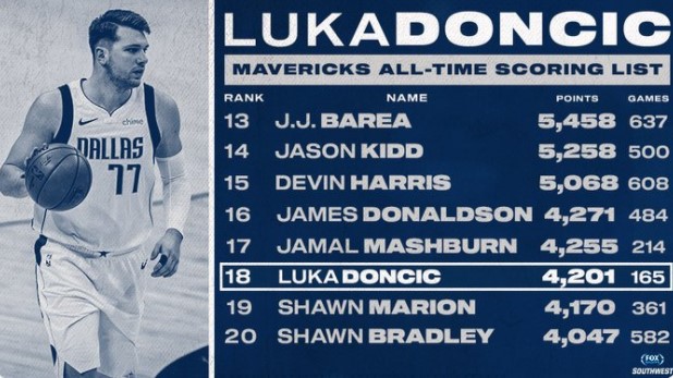 东契奇独行侠生涯总得分超越马里昂,升至队史第18位
