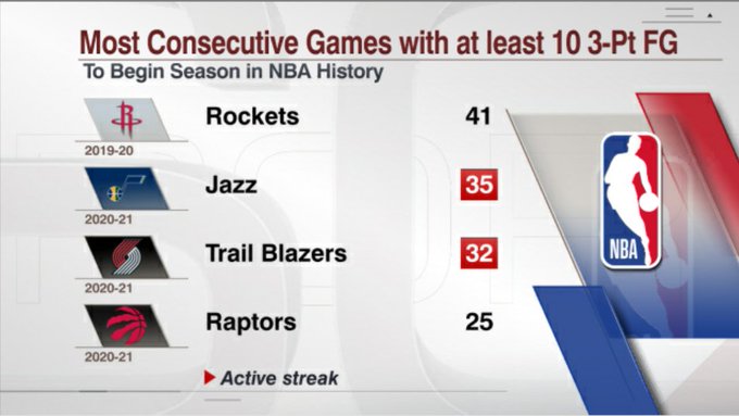 爵士开赛前35场比赛均命中10+三分球,仅次于19-20赛季火箭
