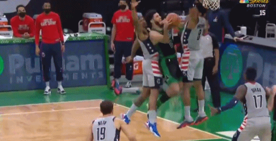 博球00703月01日讯 今日凯尔特人主场迎战奇才,比赛进行到最后时刻,凯尔特人109-110落后奇才。 凯尔特人球员杰森-塔特姆接球直杀篮下,对抗出手上篮完成