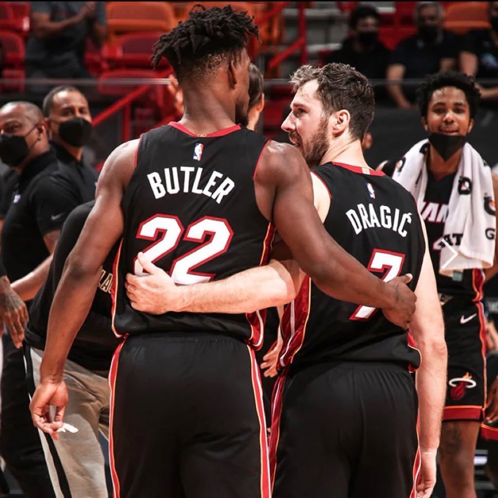 博球00702月27日讯 在今日结束的一场常规赛中,热火以124-116击败爵士。 赛后,热火球员戈兰-德拉季奇更新Instagram晒出一张与队友吉米-巴特勒