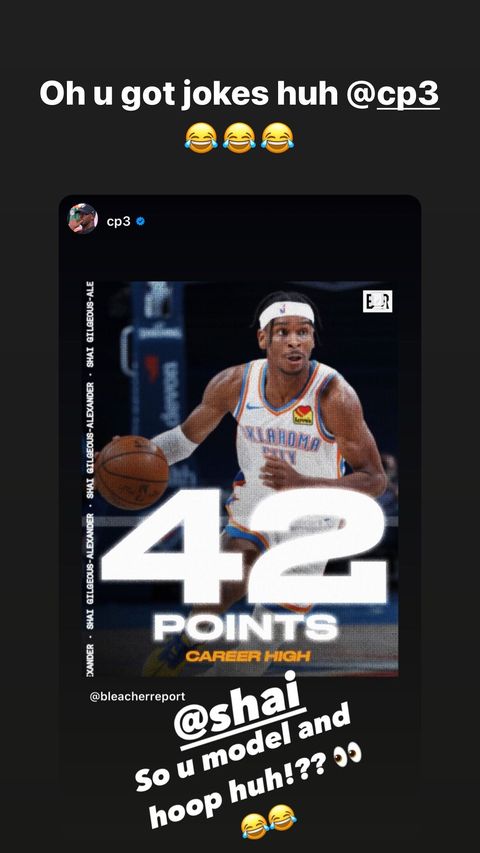 博球00702月26日讯 今日,太阳球员克里斯-保罗更新了个人Instagram Story,转发前队友谢伊-吉尔杰斯-亚历山大在昨天比赛中砍下生涯新高42分的