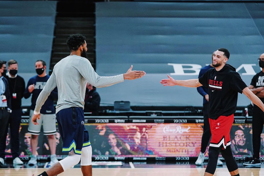 博球00702月26日讯 今日,森林狼球员卡尔-安东尼-唐斯更新了Instagram Story,晒出自己与前队友、公牛球员扎克-拉文击掌的照片,祝贺他入选全明