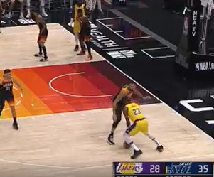 博球00702月25日讯 湖人对阵爵士的NBA常规赛正在进行中,目前比赛进行至第二节,湖人暂时落后。 湖人进攻的一次回合,湖人前锋勒布朗-詹姆斯面对爵士中锋鲁迪