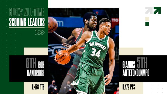 字母哥雄鹿生涯得分超越丹德里奇,升至队史第5