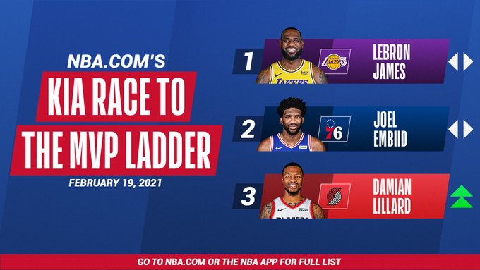 官方MVP榜:詹姆斯继续领跑,恩比德、利拉德分列二三