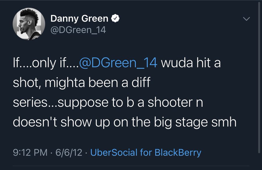 赛后Hoop Central晒出了一条丹尼-格林在2012年6月6日发布的推特,那一天格林所在的马刺在西部决赛2-4被雷霆淘汰。格林写道: