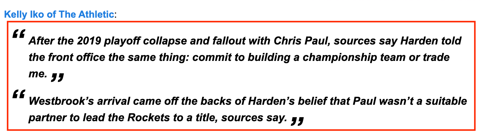 而在那年休赛期,火箭送出保罗和选秀权并且换回威少的交易。而据美媒凯利-伊科的说法,哈登在2019年休赛期也提出了交易要求: