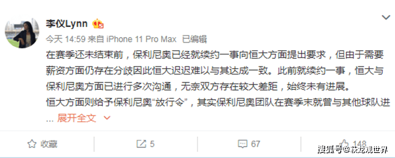 据记者李仪称,保利尼奥与恒大的合同将于2022年6月30日结束,赛季末保利尼奥欲与恒大续约,但考虑到限薪大环境,恒大难以继续提供保利尼奥一份高薪合同,于是沟通未果。恒大“放行”,暴力鸟赛季末曾与其他中超球队接触,但待遇未达一致。对于保利尼奥心生去意,恒大方面给予“放行令”,恒迷也比较理性。