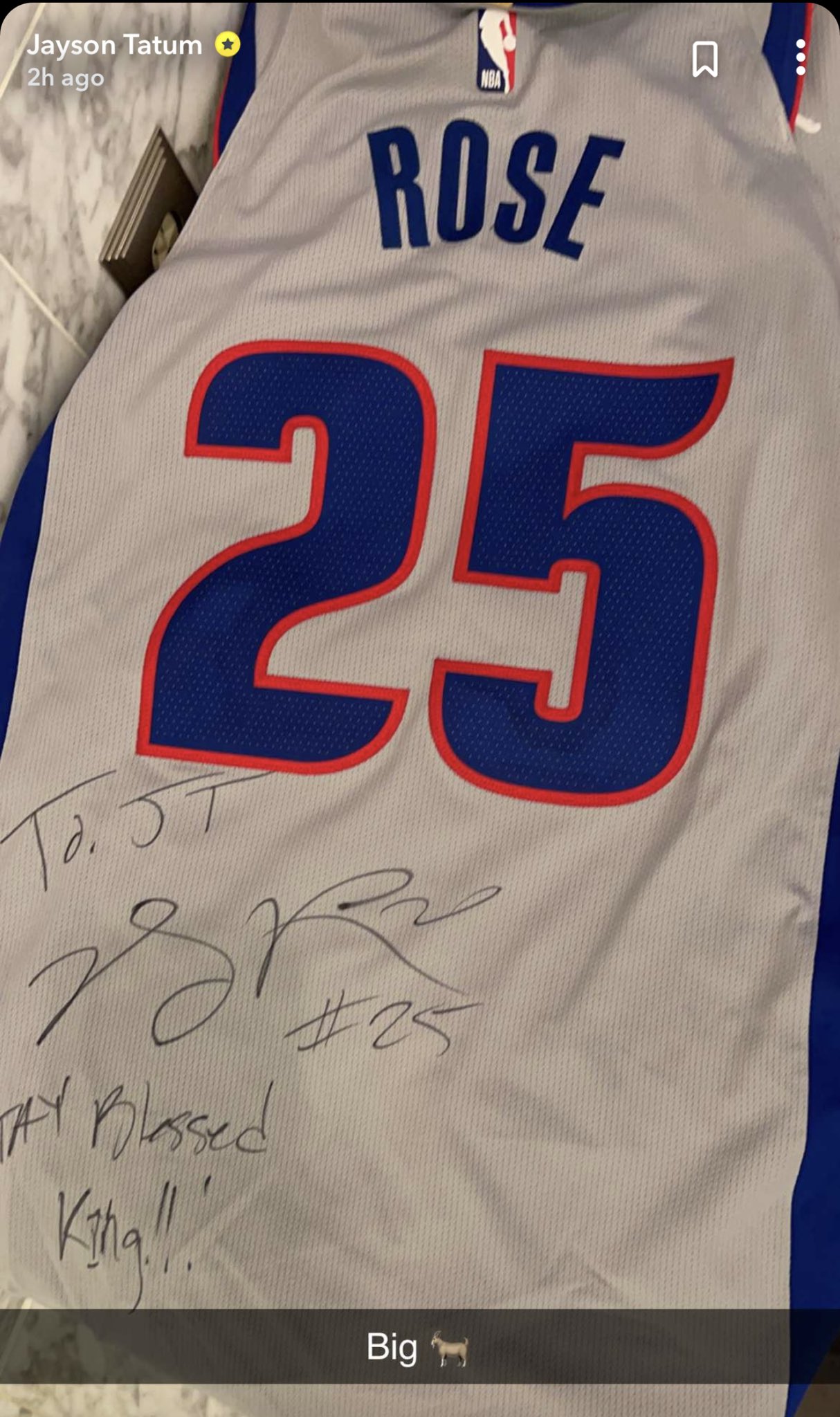 博球00701月05日讯 昨天,凯尔特人前锋杰森-塔特姆更新Instagram Story,晒出活塞后卫德里克-罗斯送给自己的亲笔签名球衣。