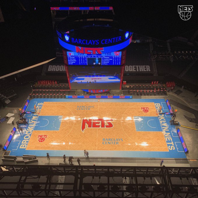 赛前,篮网官方更新了推特,展示了本场采用的复古球场地板。