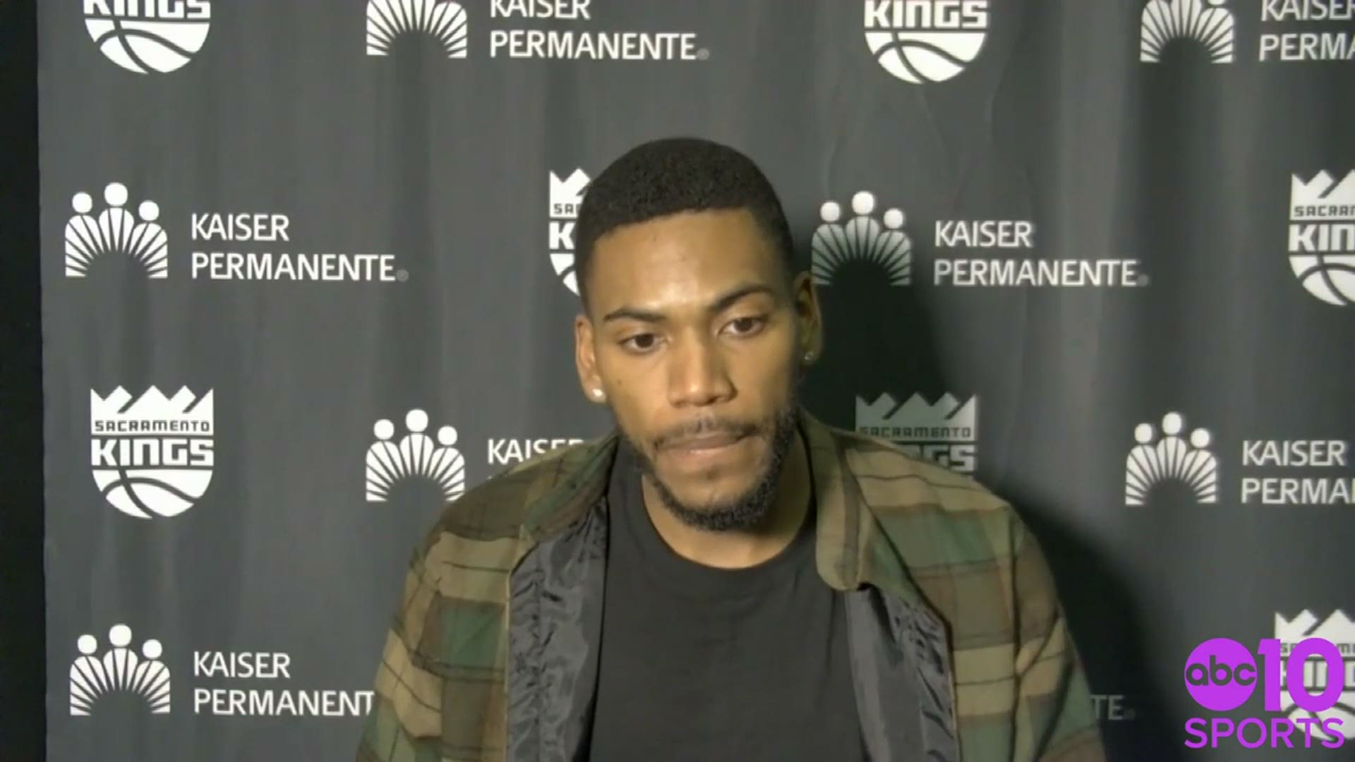 赛后,国王前锋格伦-罗宾逊三世接受媒体采访。