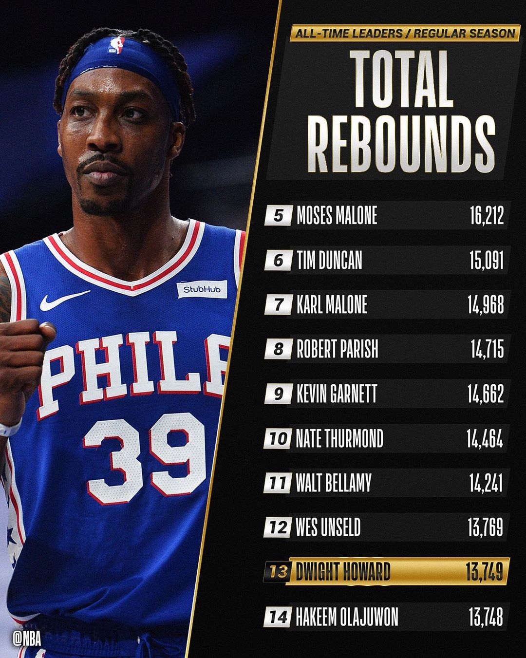 借此,霍华德的常规赛总篮板数来到13749个,超越哈基姆-奥拉朱旺(13748),来到历史的第13位。