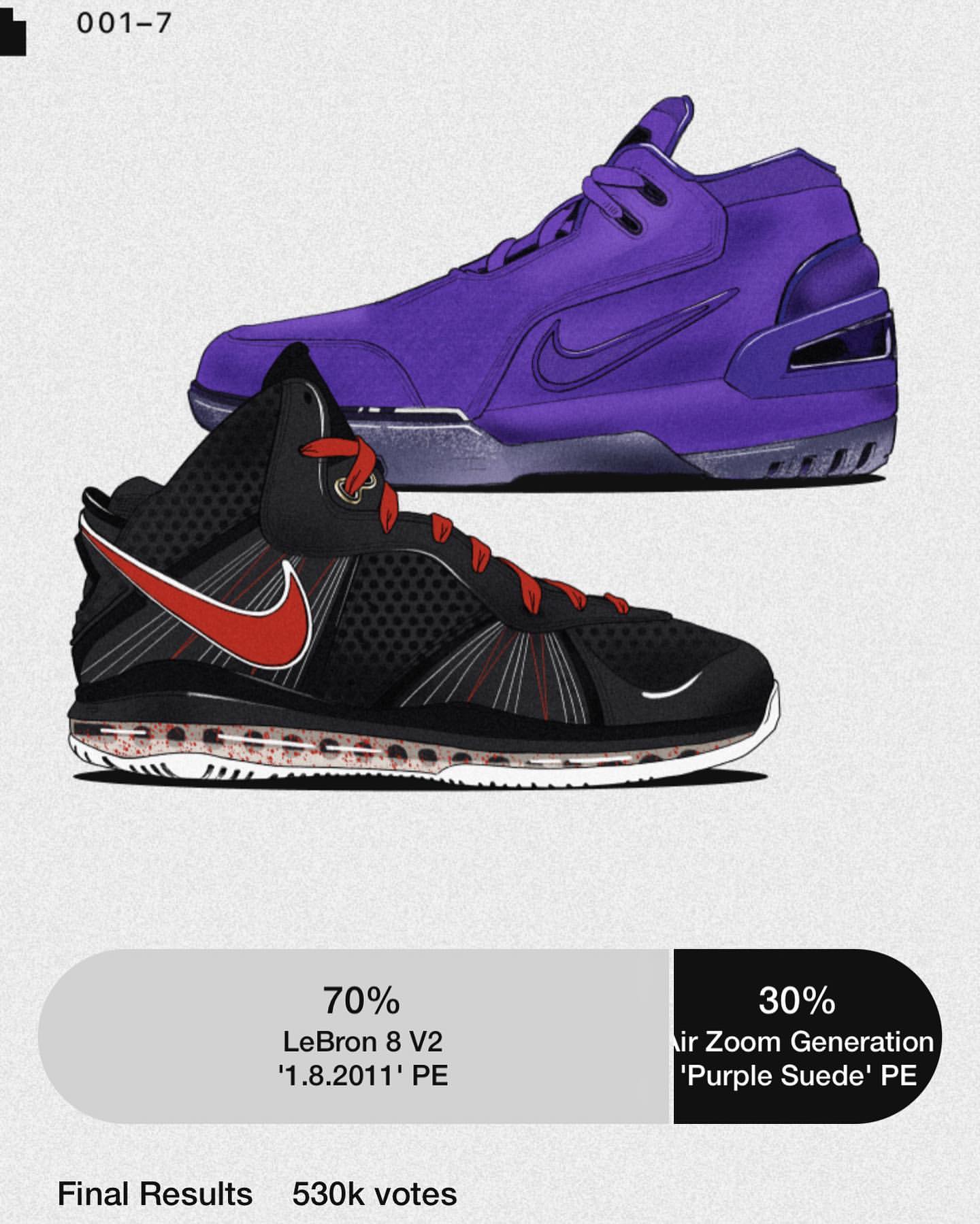 针对球鞋资讯媒体B/R Kicks发布的首轮16进8球迷投票结果,詹姆斯评论道:“不敢相信全紫绒面款詹1代以及硬木经典款詹7代输了!天啊,那些可是神圣经典款!”