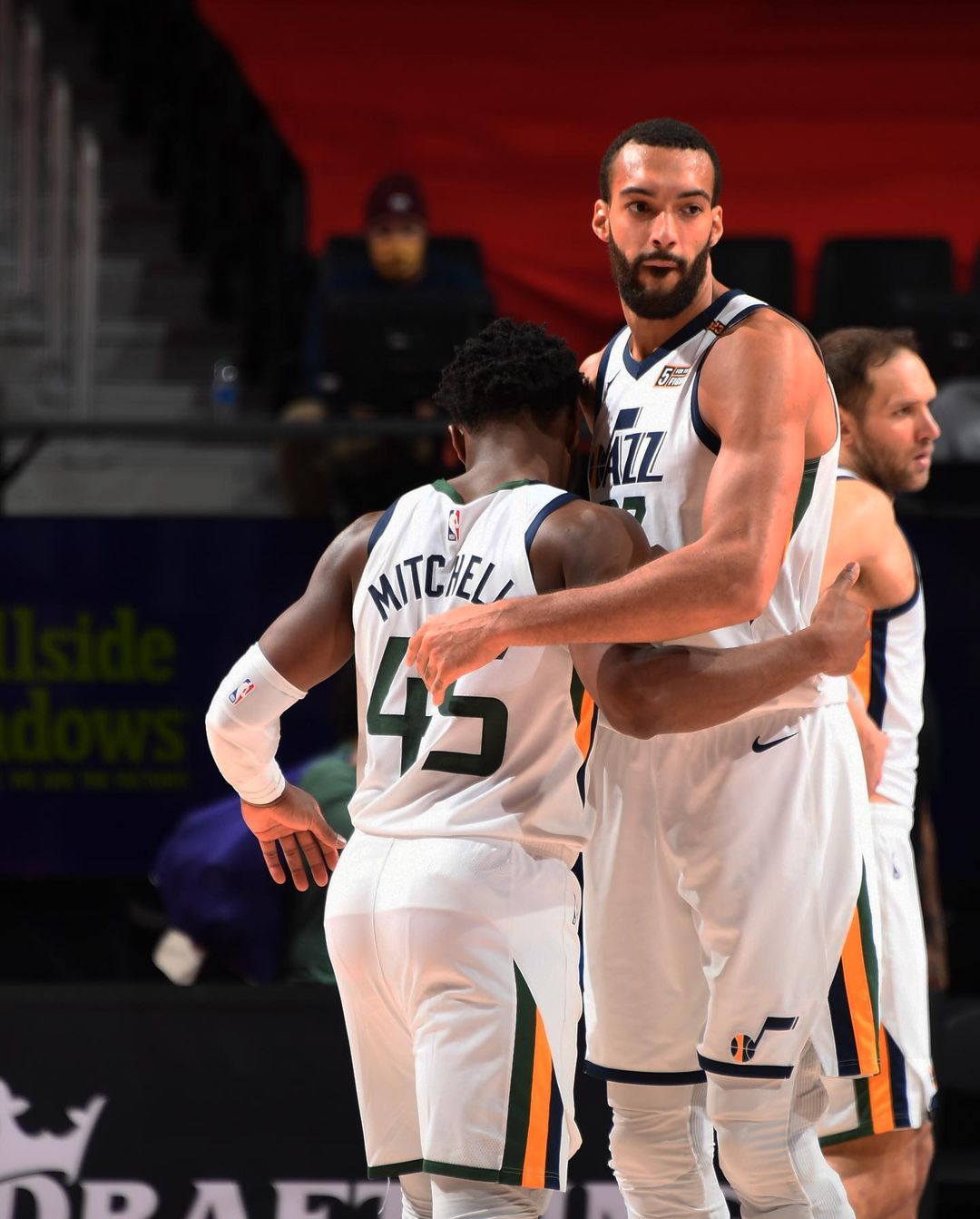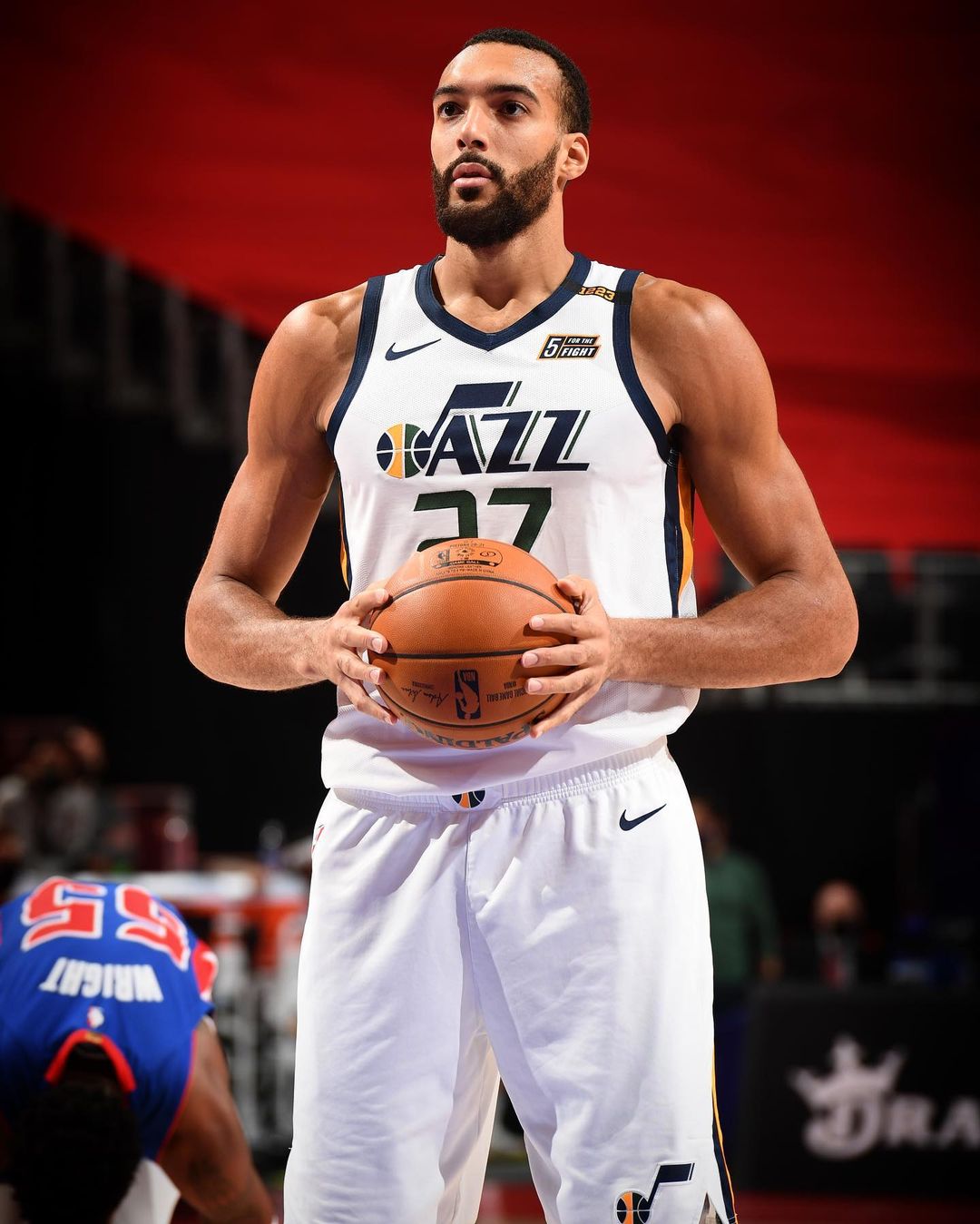 赛后,爵士球员鲁迪-戈贝尔更新Ins,晒出一组赛场照庆祝比赛胜利。