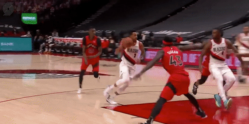 在第四节的一个回合中,开拓者球员CJ-麦科勒姆突破至篮下,打进了一记神仙进球。
