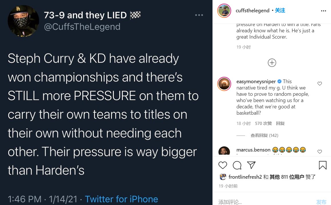 而该账号自己写到:“这听起来似乎很疯狂,但我不认为哈登身上有什么真正的夺冠压力, 球迷们都知道他,他是一名伟大的得分手。”