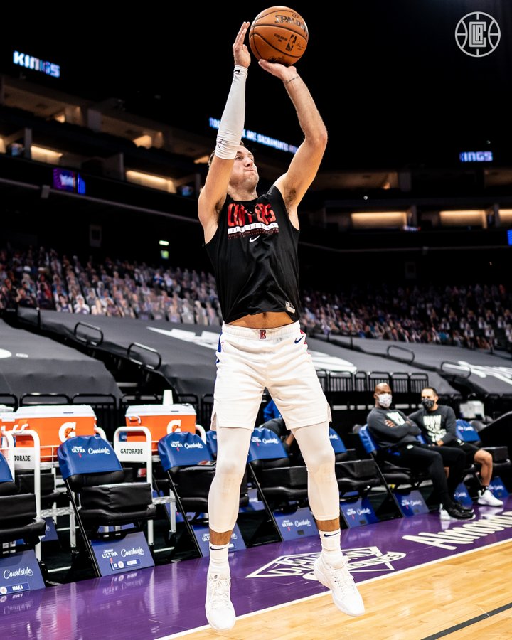 博球00701月16日讯 今日,快船官方更新推特,晒出一组快船球员保罗-乔治和卢克-肯纳德的赛前热身照与球迷分享。