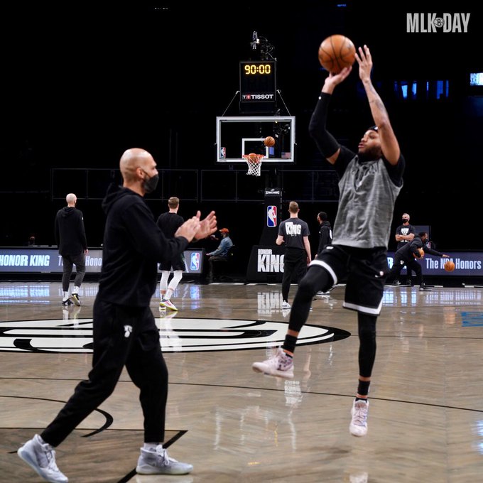 博球00701月19日讯 今日,篮网官方更新推特,晒出一组球员们赛前训练的照片为今日的比赛预热。