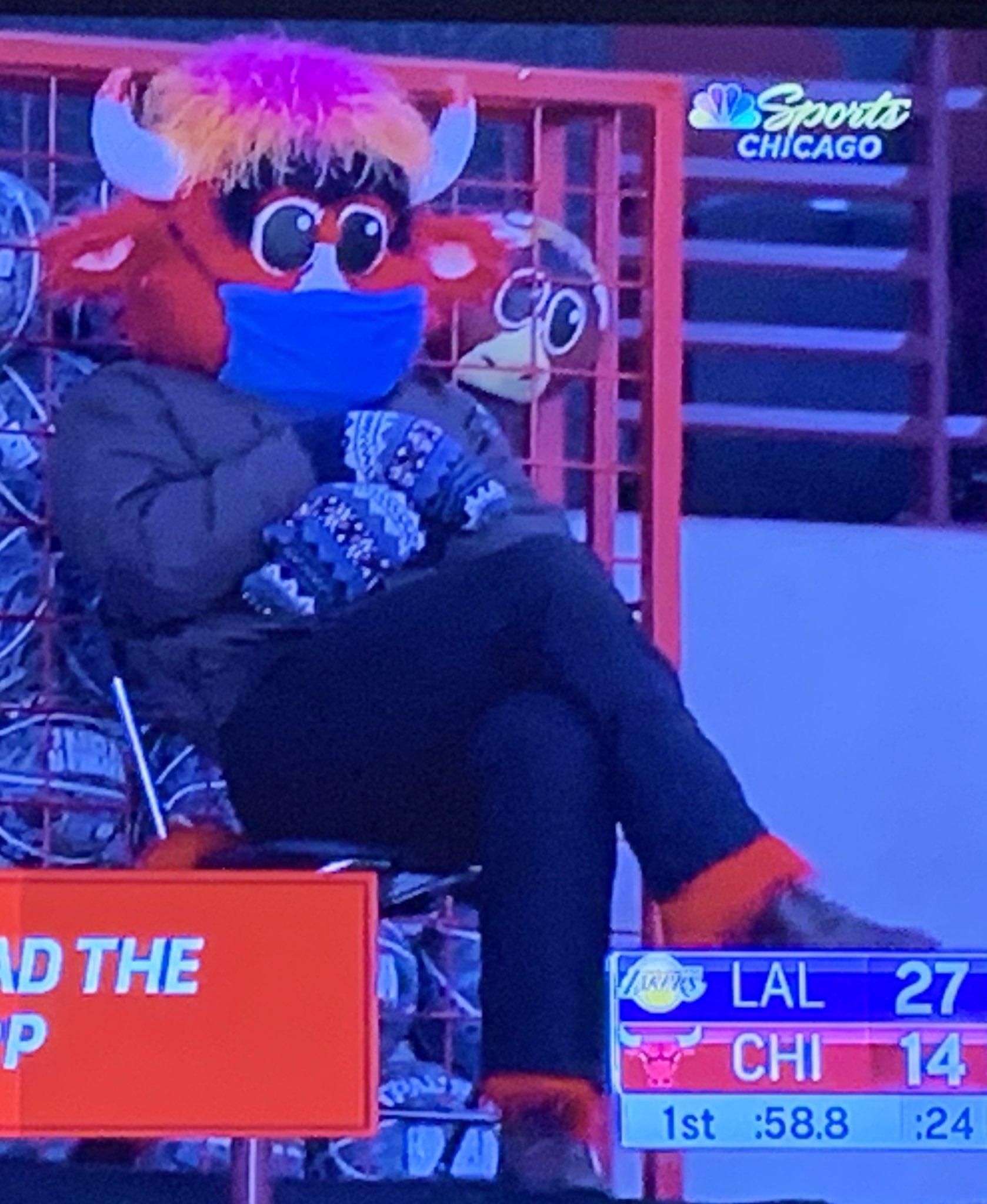 本场比赛公牛的吉祥物Benny吸引了球迷们的关注,他翘着二郎腿坐在场边,戴着巨型口罩观战。