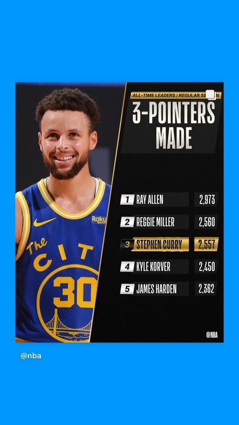 在今天的比赛中,库里命中5记三分,常规赛三分命中数超越雷吉-米勒,升至历史第二。