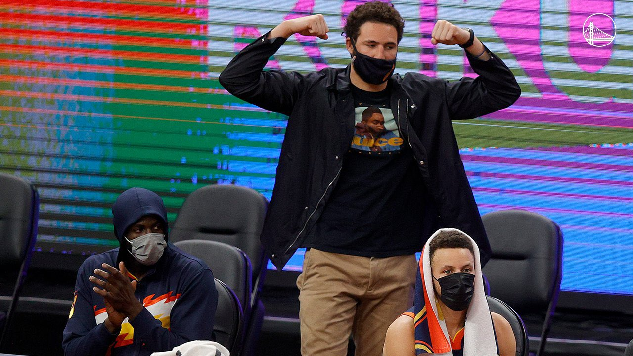 本场比赛,之前因伤病赛季报销的勇士球员克莱-汤普森出现至场边(见新闻配图),为自己的球队加油打气。
