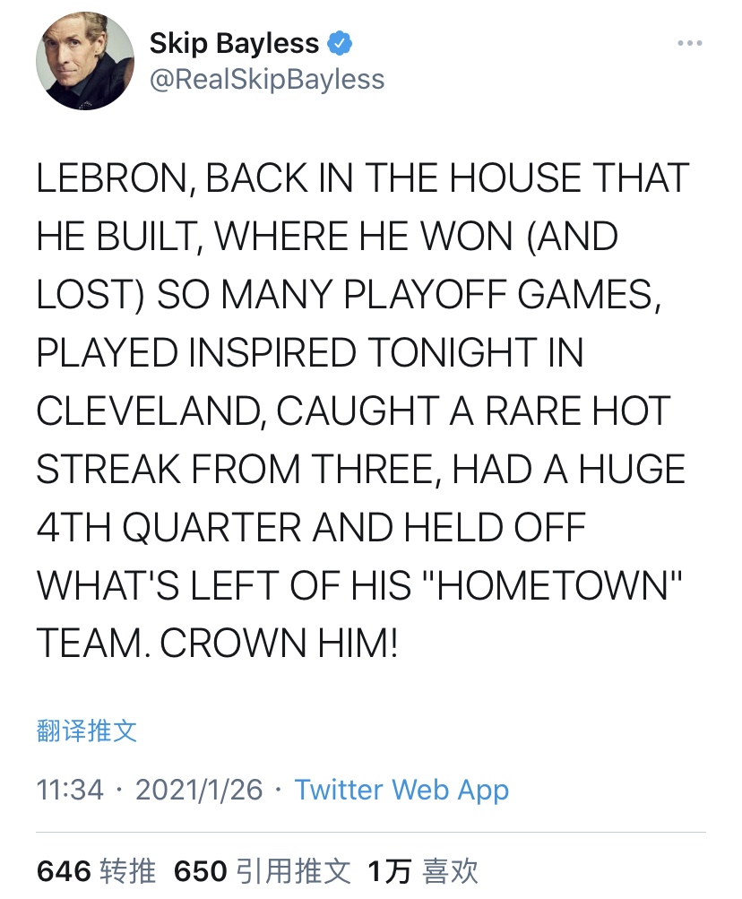 Bayless用全部大写字母写道:“勒布朗回到了他打造的建筑内,在那里他赢过(也输过)太多场季后赛,今晚他在克利夫兰带着斗志打球,三分手感之火热实属罕见,打出了爆发式的第四节表现,阻挡了他‘家乡球队’剩余的反扑之力。为他加冕吧!”