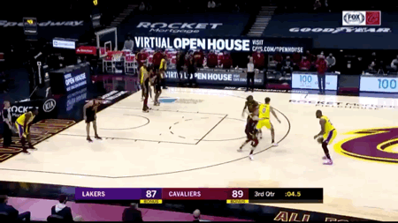 博球00701月27日讯 在昨日湖人115-108客场击败骑士的比赛第三节临近结束前,湖人前锋勒布朗-詹姆斯的一次背身单打压哨投篮不中。