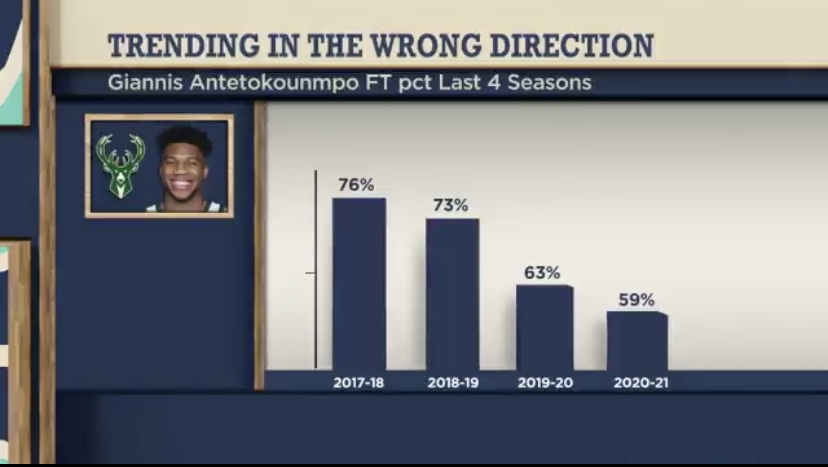 谈到阿德托昆博最近四个赛季逐年下滑的罚球命中率,卡特说:“罚球每年都在下滑,我认为他就会想,‘好吧,我要变得完美,我需要修正它。’所以每一年他都在思考前一年出了什么问题,我认为他就是想法太多了。有时,他看起来动作很机械化。因为假如你仔细观察他的一些罚球视频,他的头部太靠后了,这样导致有时他投短了或者偏右。因为当他的头向后仰,他的肩膀也就后倾,他经常投短。我认为他就是对此有想法。一旦他举起球到那一步,他在思考,‘我应该把球往高投,而不是靠外。’总之就是各种不同的事情,我认为他投罚球时头脑里思绪万千。假如他可以稳定好自己的想法,你会看到他的罚球命中率将大有长进。”