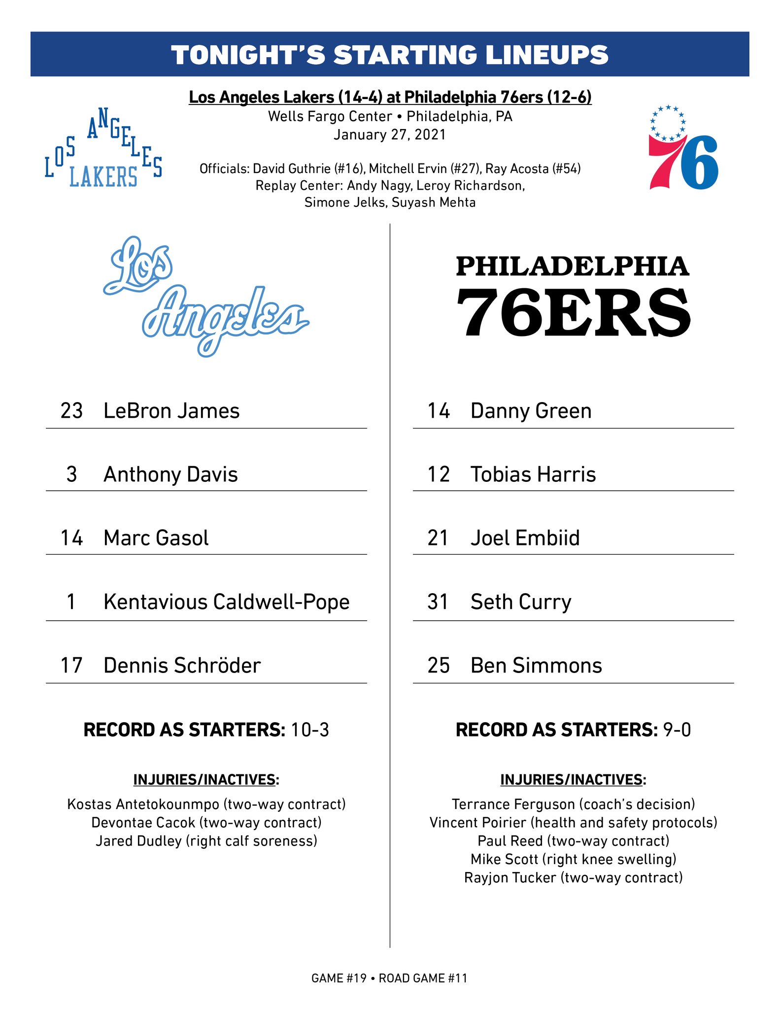 博球00701月28日讯 76人和湖人官方赛前公布了今日比赛的首发阵容。 76人首发:本-西蒙斯、塞思-库里、丹尼-格林、托拜厄斯-哈里斯、乔尔-恩比德。 湖人首发:丹尼斯-施罗德、肯塔维厄斯-考德威尔-波普、勒布朗-詹姆斯、安东尼-戴维斯、马克-加索尔。 双方的比赛将于8:30开始。