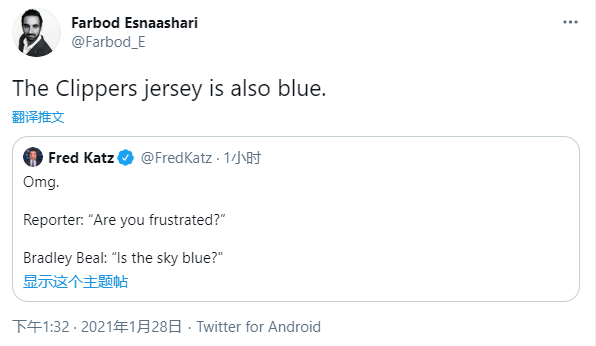 随后,快船队记Farbod Esnaashari转发了这则推文,并评论道:“快船球衣也是蓝色的。”
