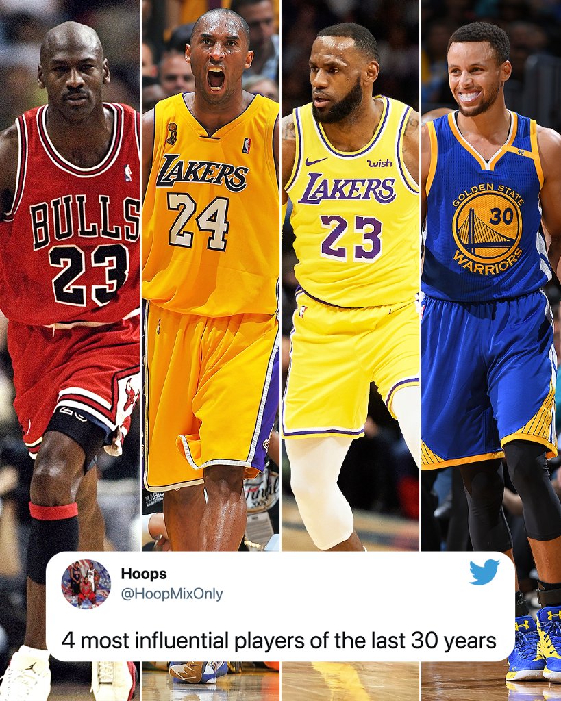 “过去30年里影响力最大的四位球星。”并配上了迈克尔-乔丹,科比-布莱恩特,勒布朗-詹姆斯和斯蒂芬-库里的照片。