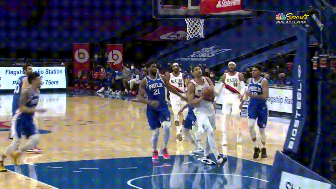 76人中锋乔尔-恩比德在封盖对手时疑似伤到膝盖,目前已经返回更衣室。
