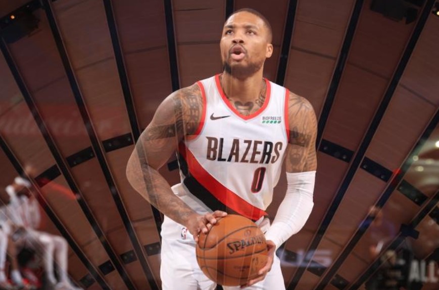 赛后,开拓者后卫达米安-利拉德接受媒体采访。